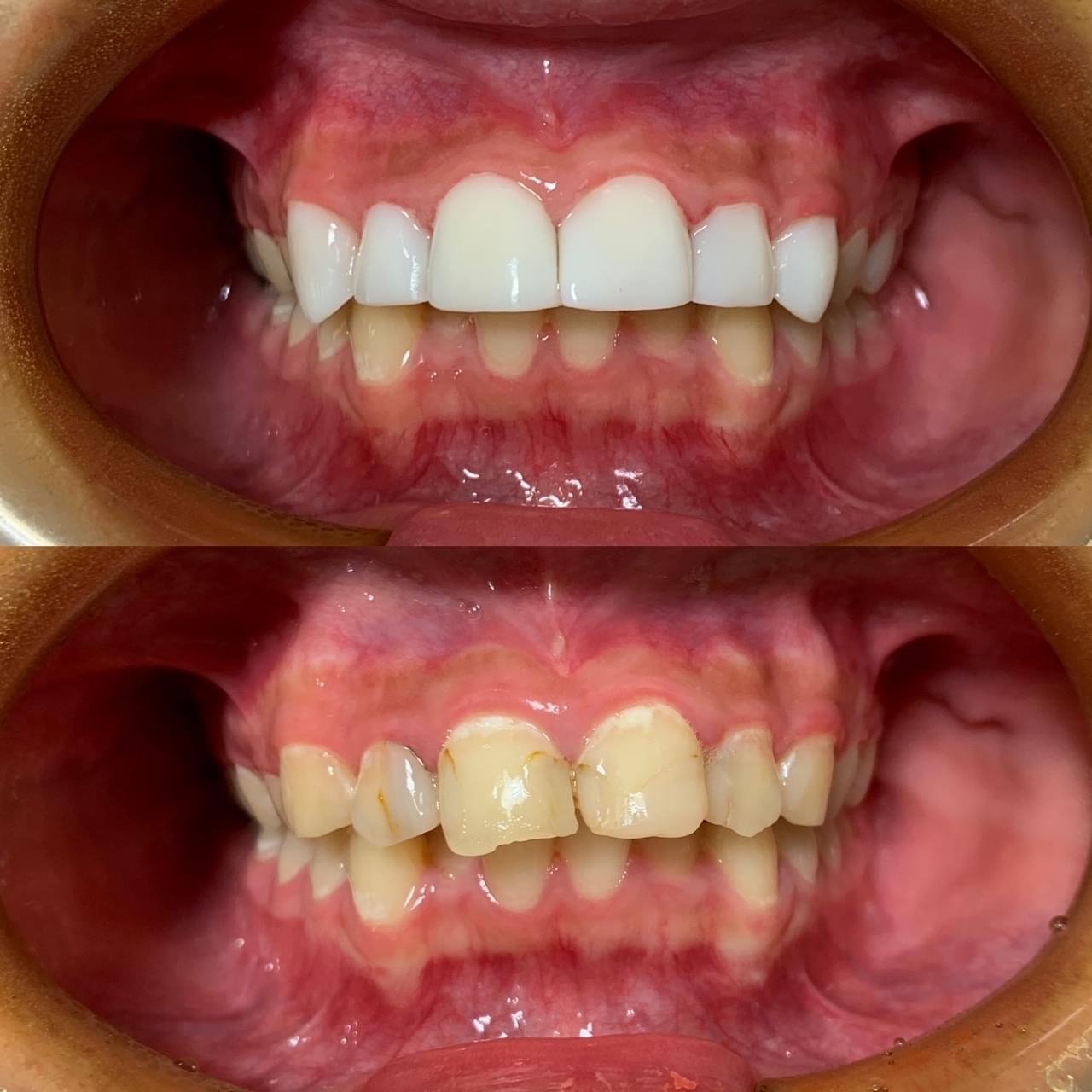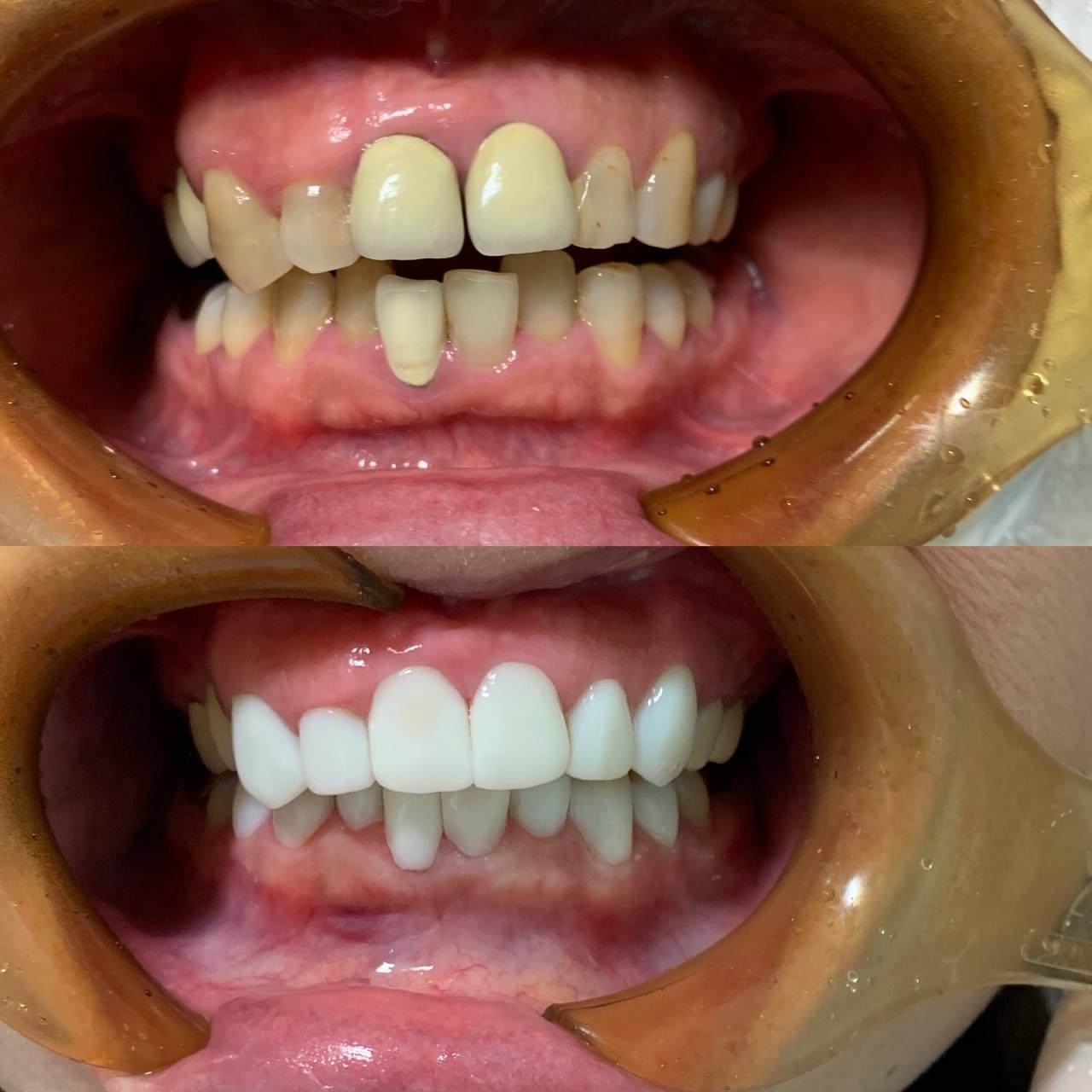 3本は冠が入っていたのでその部分はセラミックの冠で治しました。治療回数2回で上下合わせて16本を治療完了