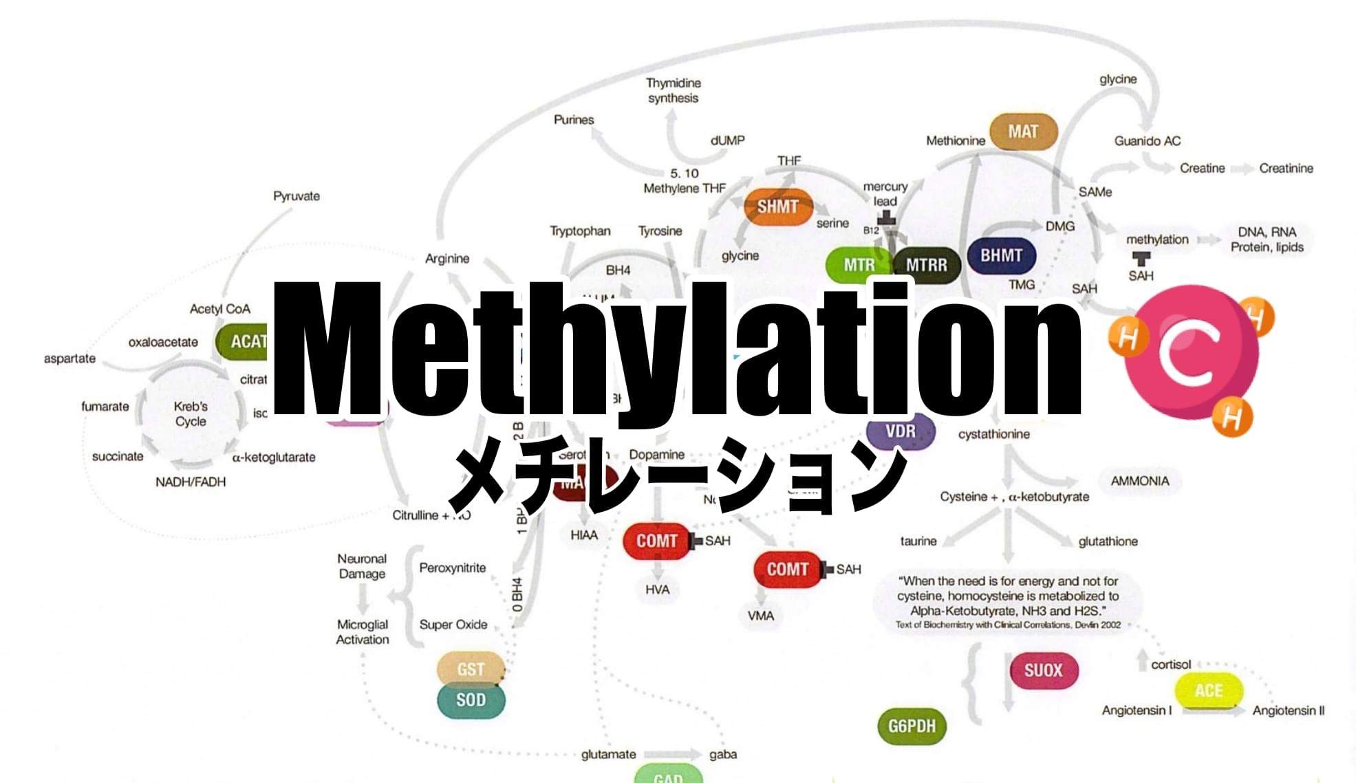 Dr. Amy Yaskoはこのメチレーションに関連する経路内の酵素の遺伝子変異を迂回するサポートを行うことで、メチレーション機能を改善し自閉症やアルツハイマーなどの神経疾患の改善を可能にするプログラムを完成させました。メチレーション回路内酵素の遺伝子の突然変異(SNPs:一塩基変異多型)を調べることでその酵素の働き・活動性を予測します。遺伝子変異は不変ですのでこのプログラムで遺伝子変異が改善するわけではありません。また、この遺伝子変異が自閉症のすべての原因であると考えることは難しいです。しかし、この遺伝子変異をサポートし本来の機能を取り戻すことで自閉症の回復を目指すことは可能です。