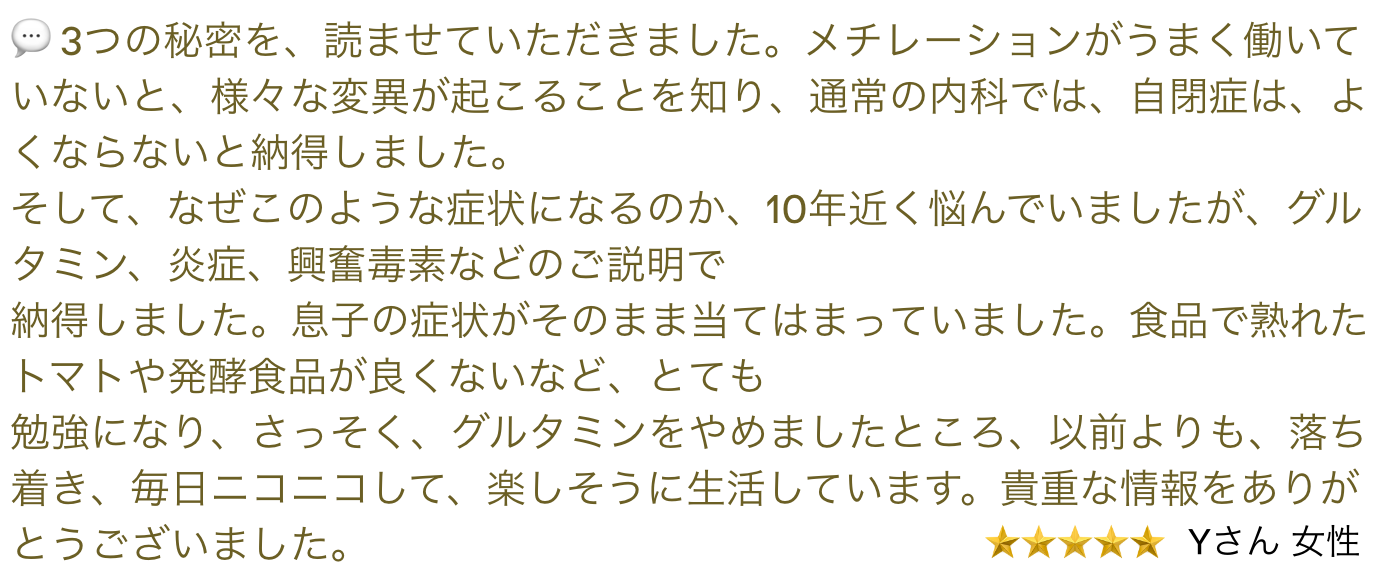 そのため私は、このプログラムを実践するために必要な情報を提供し、一人でも多くの自閉症の子供達の未来を守りたいという思いでこの本の執筆を決心しました。この本ではDr. Amy Yaskoプロトコールを実施する上で必要な生化学的な知識や理論、使用するサプリメントに関する情報、使用するバイオケミカル検査に関する情報、プロトコールの進め方などについて記載しています。アメリカでDr. Amy Yaskoプロトコールを実践しているご家族はとても知識が豊富です。なぜご家族に知識が必要であるのでしょう?それは、自閉症の子供達をもっとも身近で毎日見ているのは我々ではなくご家族だからです。プロトコールを進行していく中で使用する栄養サプリメントや日々の食事の中で変化する子供の反応を、もっとも身近にいるご家族が見てあげなければいけないからです。「知識は力である」まさにこの言葉のとおり、知識という力を溜めて下さい。その力は、きっと子供達を助けるでしょう。