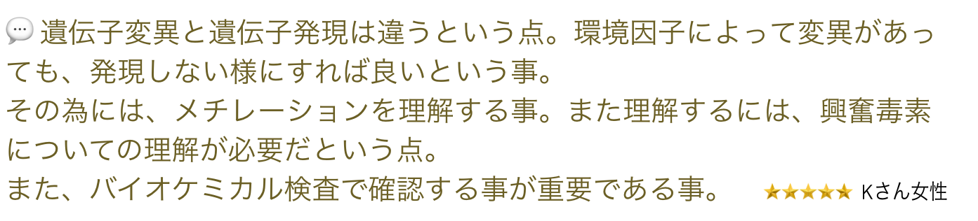 このプログラムでもっとも焦点を当てているのは「メチレーション」です。自分の遺伝子を正しく発現させたり、望まない遺伝子発現を抑制したりするためにこのメチレーションが必要になります。体内に侵入したウィルスや細菌、曝露した重金属などの毒を解毒し排泄させるためにも必要なのがこのメチレーションです。