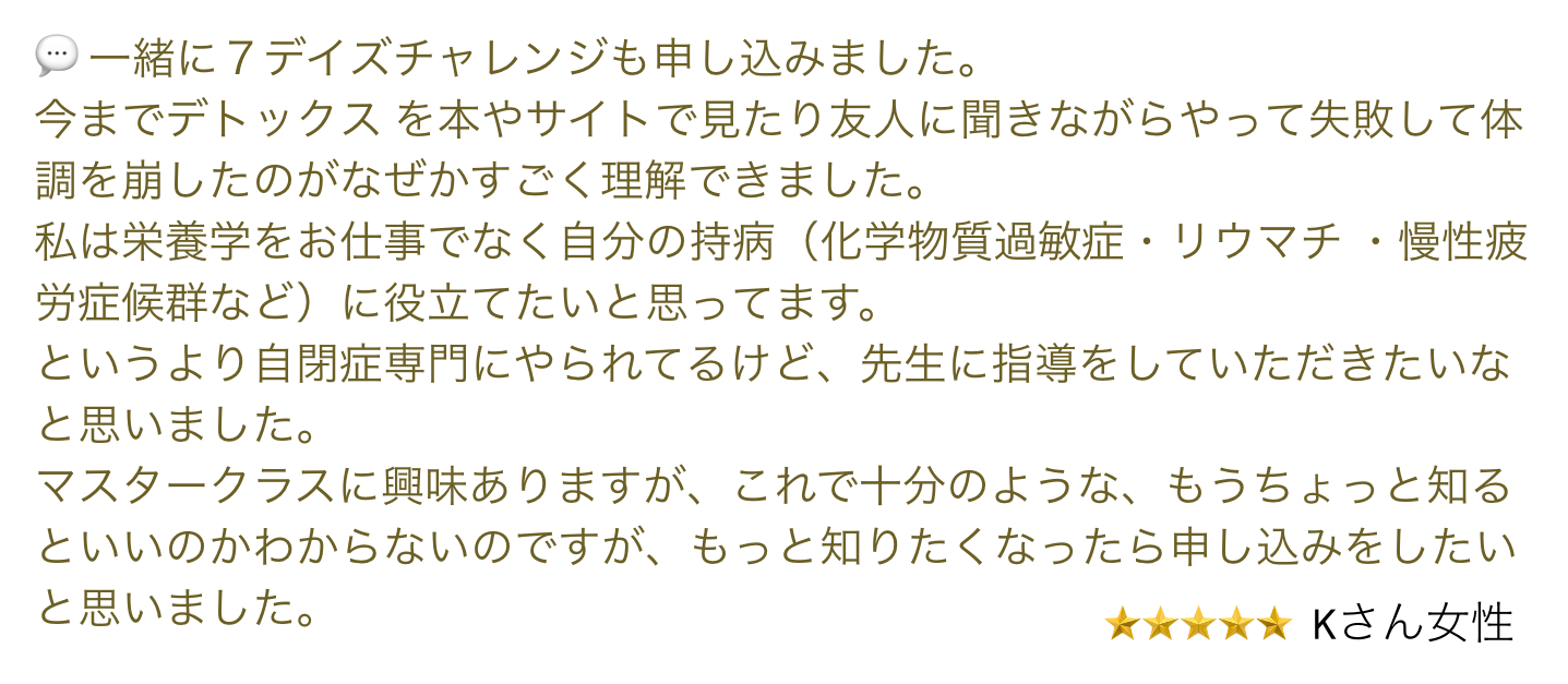 私は現在、日本においてこのプログラムを約80人以上の子供たちに実施サポートしております。そして大変良好な結果を出しています。その中には「自閉症」という診断が実際に消えたお子さんもいます。現在日本においては自閉症回復の手段がありません。出現する症状に対して薬剤を使用し抑制することしかできません。
